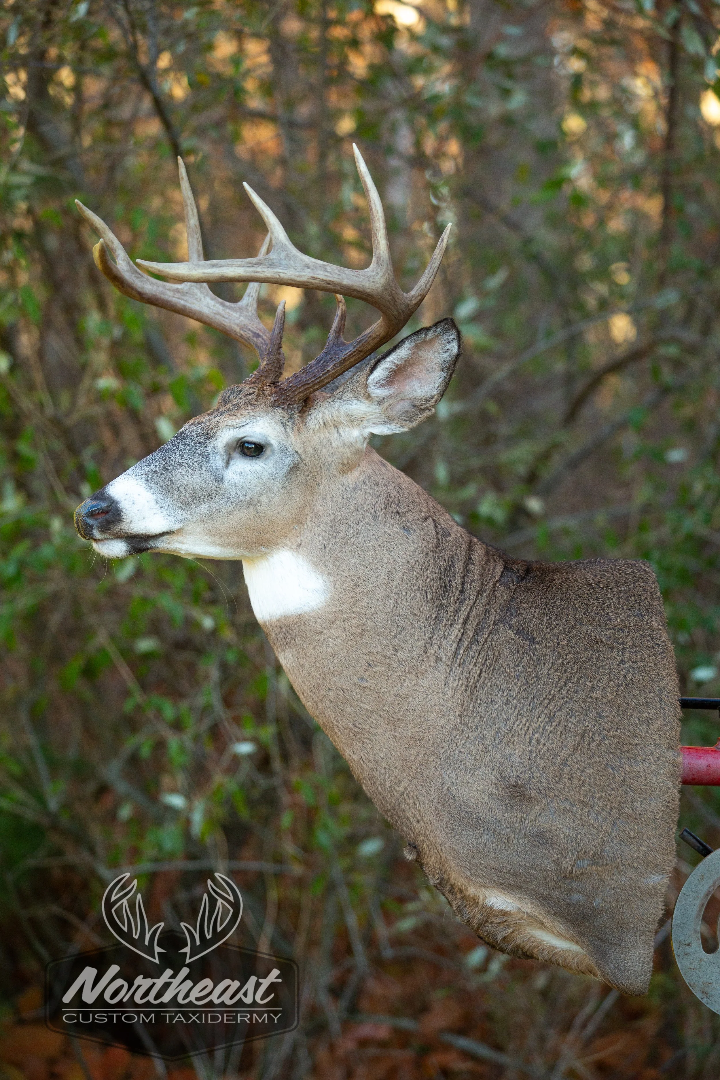 The next morning a guy that I had met working on my barn came back with his dog and the dog tracked the trail back to the bed and beyond. The buck had only gone another 100 yards, but unfortunately the back half was mostly eaten by coyotes. I tagged him and, since the front half was relatively untouched, took him to the butcher to be caped for a shoulder mount. The butcher said he would probably have weighed around 180 pounds if whole. I had a nice trophy, but no meat. I learned a lesson - next time I will go home, have dinner, and come back at least four hours later to do the tracking. This is the second time I have had a buck ruined by coyotes when I waited overnight.
