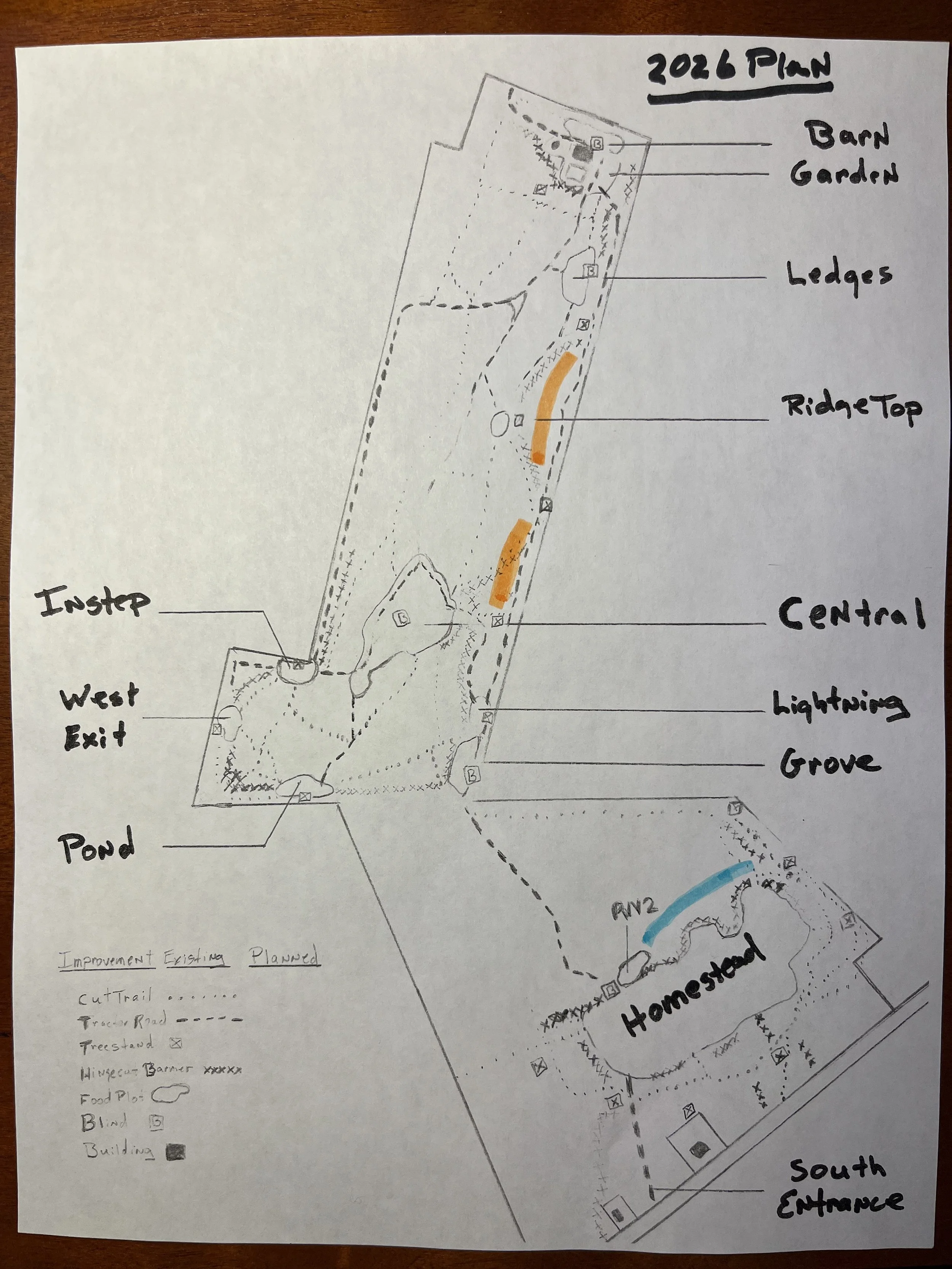 I have several things that I want to get done in 2026, but fewer projects than in the past. The Redneck box blinds are a little tricky to unlock and climb into as you have a bow in your hand, so I have “porch extensions” to install on each of them. It would make a big difference to the hunting on the northeast side of the property if I could push the deer to the stands on that side rather than allow them to come and go through the woods, so I actually want to put up fencing along that side.